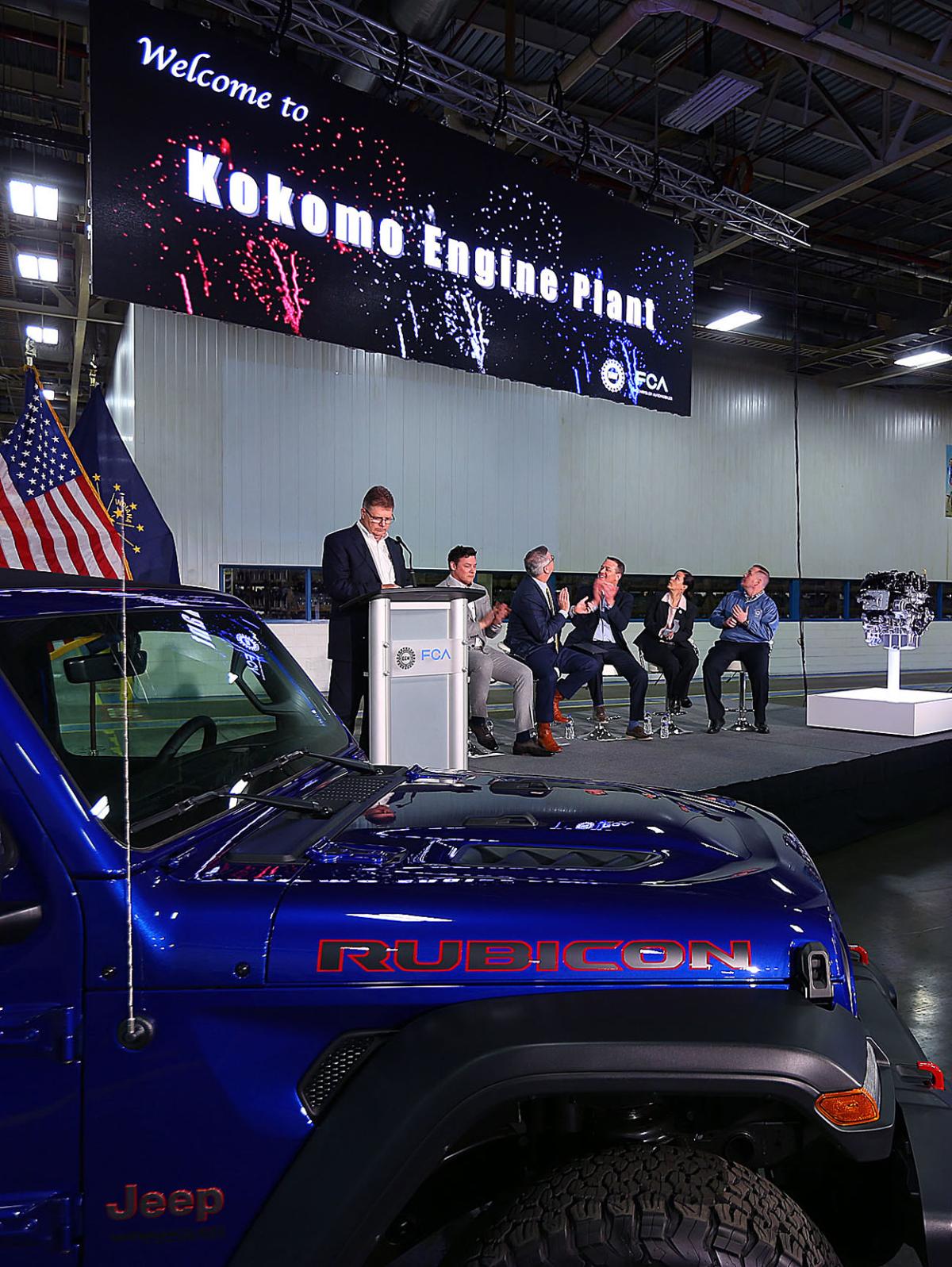 Fiat Chrysler Automobiles NV. FCA COO Mark Stewart right shows off the 20-liter inline four-cylinder turbo engine the Kokomo Indiana plant will build. March 5 2020 Kokomo Ind.