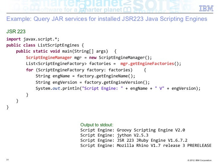 Java scripting engine jython. It allows multiple scripting languages to be used through the same API as long as the language provides a script engine. It thus allows you to run Python on any Java. Interactive experimentation - Jython provides an interactive interpreter that can be used to interact with Java packages or with running Java applications.