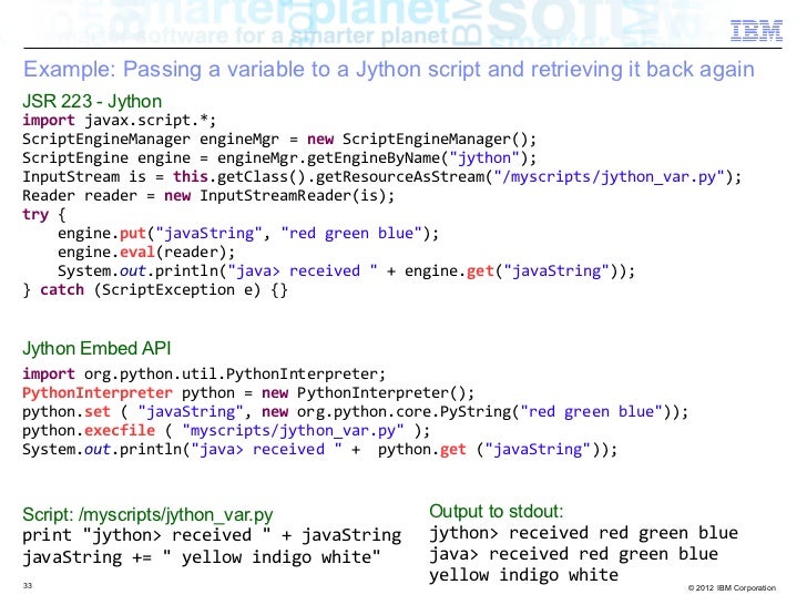 OK next up we want Java to be able to execute a Jython script proper. You should be able to start a script editor from File-New-Script. 22 rows The following code block is a Java program having an embedded Jython script.