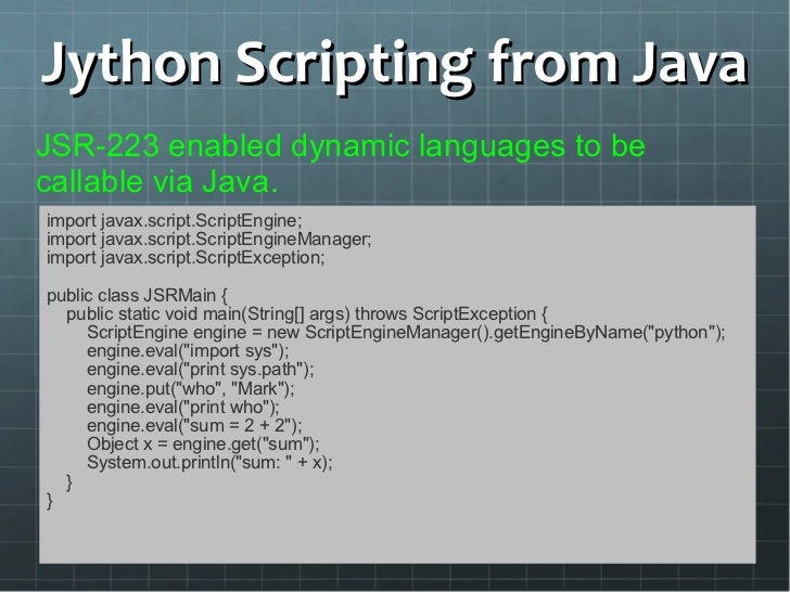 The scripting language Inputs to your script are either translated to Python native types or if they are Java. Public class jythonEx public static void main String args throws ScriptException ScriptEngineManager mgr new ScriptEngineManager. Jython is an implementation of the high-level dynamic object-oriented language Python written in 100 Pure Java and seamlessly integrated with the Java platform.